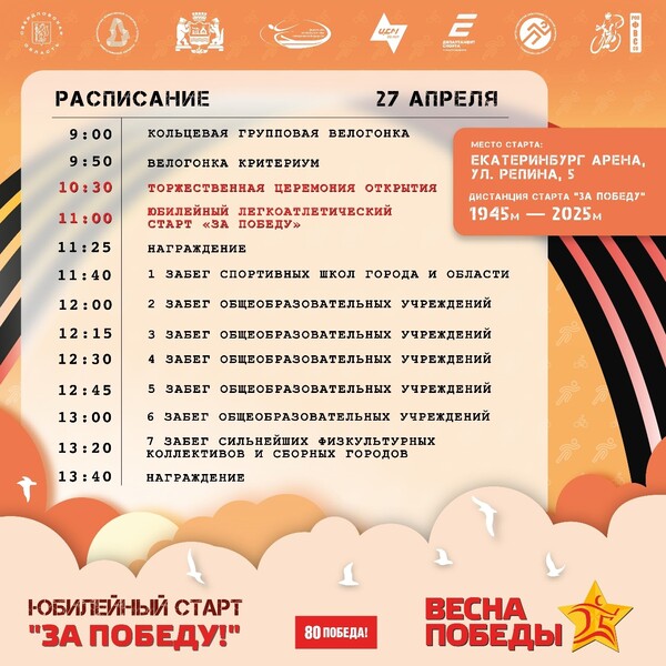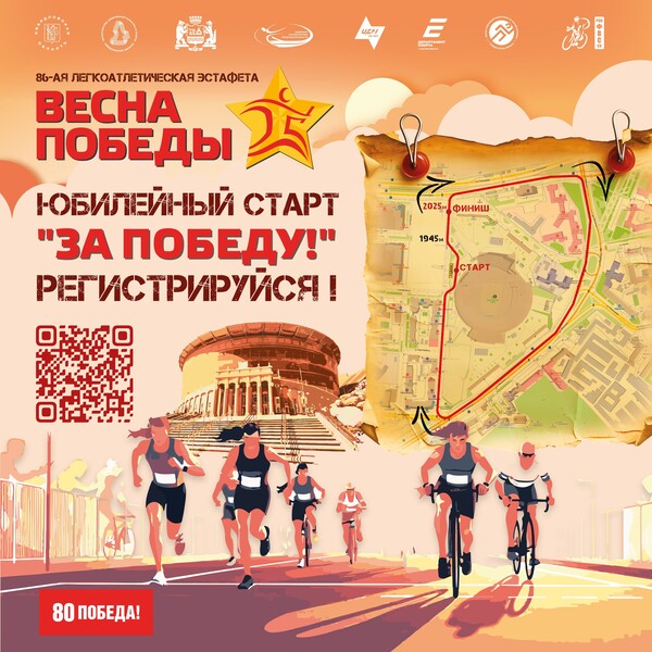В Екатеринбурге 27.04.2025 состоится традиционная легкоатлетическая эстафета «Весна Победы», которая является визитной карточкой региона и в текущем году посвящена 80-летию Победы советского народа в Великой Отечественной войне.